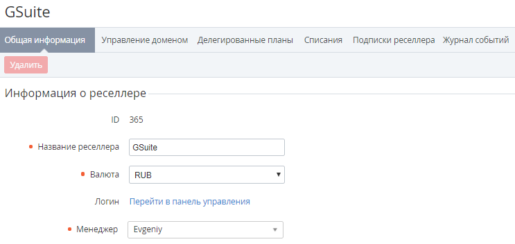 Страница Реселлера содержит следующие вкладки: