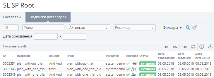 - столбца Менеджер - отсутствует. Вместо него отображается столбец Реселлер, показывающий название Реселлера, продавшего Подписку.