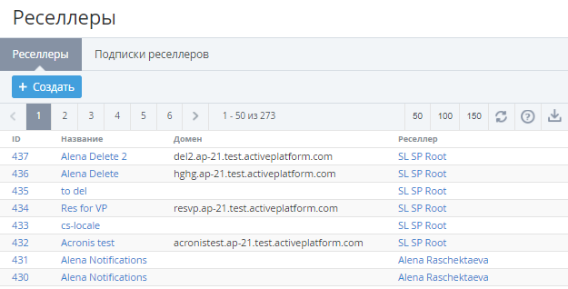 - На Панели навигации перейти в раздел Реселлеры (см. Навигация по Панели управления Оператора). Откроется страница Реселлеры.