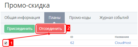 6. На Панели инструментов вкладки Планы нажать кнопку Отсоединить. Скидка не может быть использована для отсоединенного тарифного плана. При этом действие использованных скидок не отменяется.