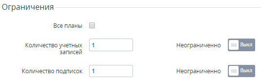 3. В поле Количество подписок задать число Подписок, которые смогут использовать данную Скидку. Для применения Скидки для неограниченного числа Подписок необходимо установить переключатель Неограниченно в положение Вкл.