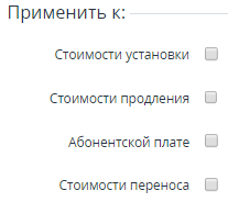6. В группе полей Применить к выбрать типы стоимостей (см. Атрибуты Списаний), для которых будет применяться Скидка: