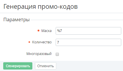 - На Панели инструментов вкладки Промо-коды нажать кнопку Сгенерировать промо-коды. В рабочей области отобразится страница Генерация промо-кодов.
