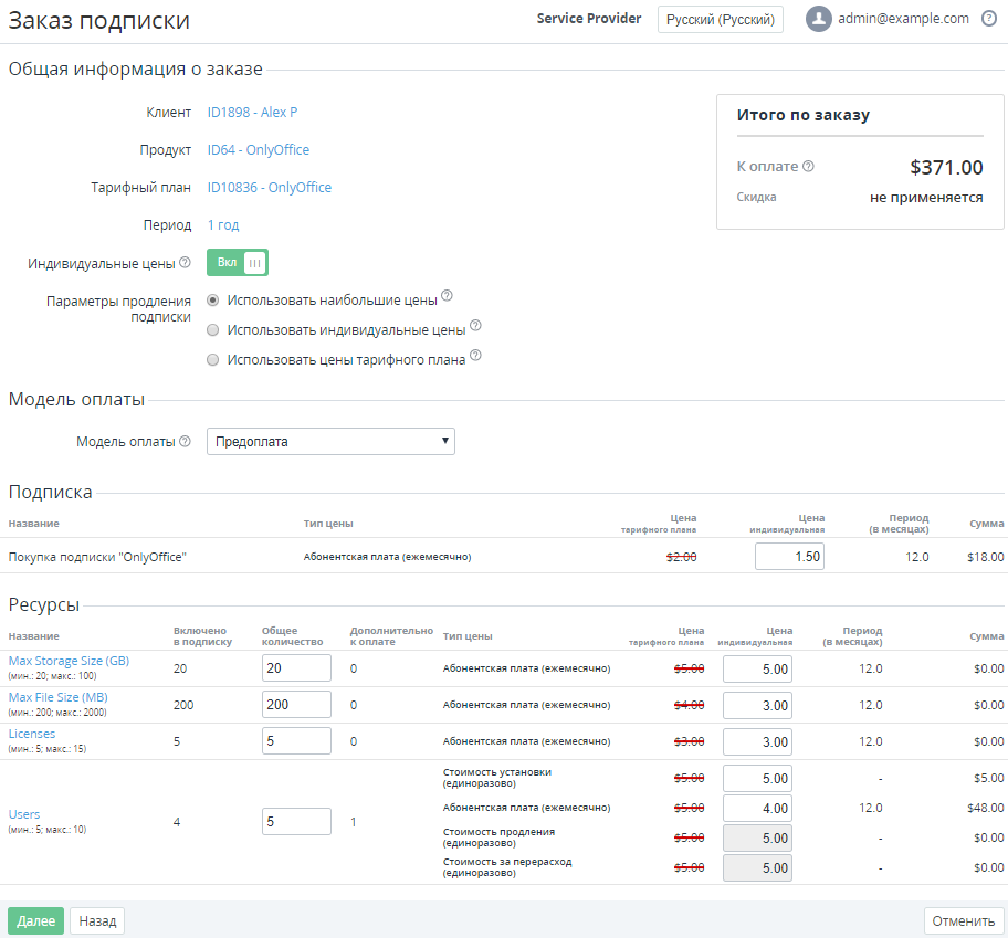 На странице с информацией о Тарифном плане, периоде и Ресурсах Подписки необходимо установить переключатель Индивидуальные цены в положение Вкл. В группе Параметры продления подписки выбрать один из вариантов тарификации Подписки при её продлении: