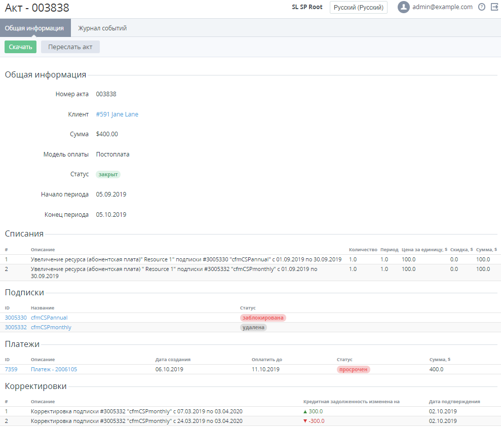 Чтобы просмотреть подробную информацию об Акте для модели Постоплата (см. Создание Правила обслуживания), необходимо: