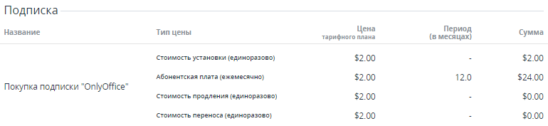 • Сумма — стоимость Подписки и Ресурсов.