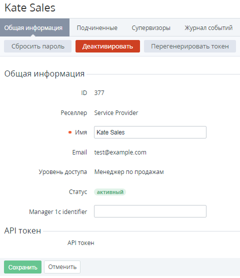 Группа полей API токен и кнопка Перегенерировать токен отображаются только на странице Сотрудника, под которым выполнен вход в Панель управления Оператора (см. Перегенерация API токена Сотрудника).