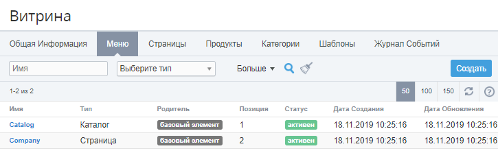 - Активный — Пункт меню доступен в Витрине Customer Store.