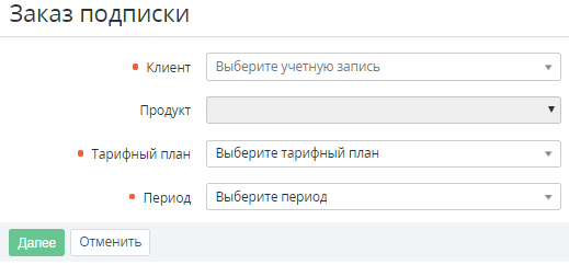 - В списке Клиент выбрать Клиента (см. Управление Клиентами), для которого заказывается Подписка.