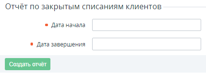 - В группе элементов Отчет по закрытым списаниям клиентов в полях Дата начала и Дата завершения с помощью Календаря установить период формирования отчета.