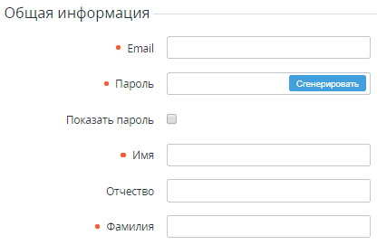 • Пароль — пароль Пользователя для входа в Панель управления Клиента. Для пароля необходимо использовать латинские буквы и цифры. Длина пароля минимум 8 символов. Флажок Показать пароль позволяет показать вводимые символы. Кнопка Сгенерировать позволяет создать пароль автоматически.
