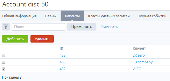 4. Перейти на вкладку Клиенты (Клиенты реселлера — для Скидок типа Реселлер). Отобразится список присоединенных Клиентов (см. Просмотр cписка присоединенных Клиентов).