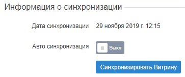 2. На Панели навигации перейти в раздел Витрина (см. Навигация по Панели управления Оператора). Отобразится вкладка Общая информация, содержащая группу элементов Информация о синхронизации.