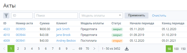 - На Панели навигации перейти в раздел Акты (см. Навигация по Панели управления Оператора). Откроется страница Акты.