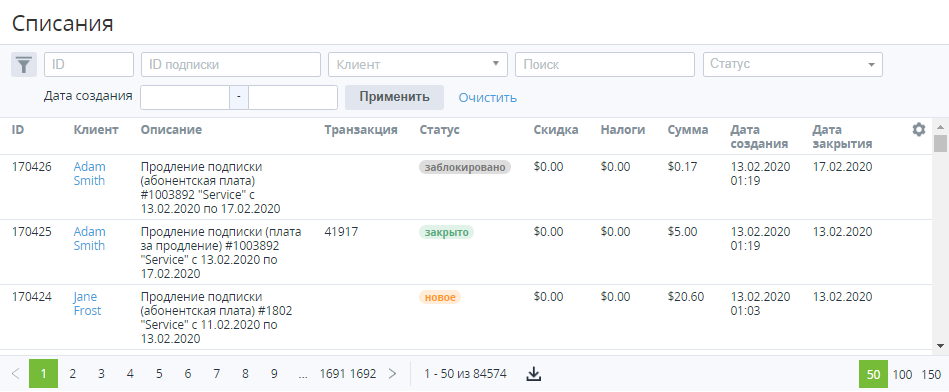 - Клиент — ссылка на Клиента, для Подписки которого сформировано Списание.