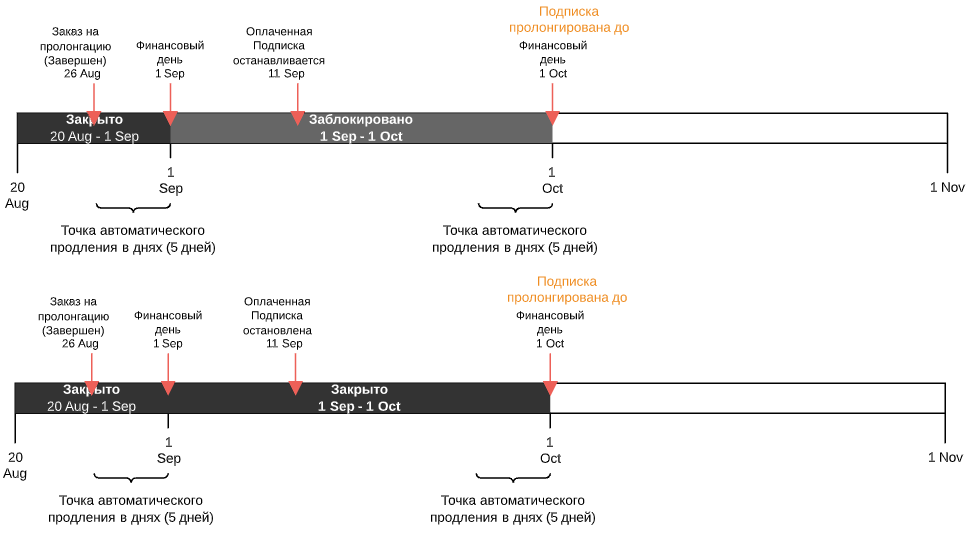 - Если Заказ создан до наступления даты Пролонгирована до, то задается период с даты начала следующего Финансового периода до даты его конца или до даты истечения Подписки (в зависимости от того, что наступает раньше).