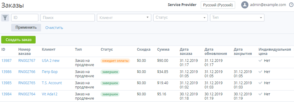 - Дата обновления — дата и время последнего обновления Заказа.