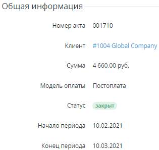 - Клиент — имя Клиента, которому выставлен Акт. Является ссылкой на страницу Клиента (см. Просмотр и обновление информации о Клиенте).