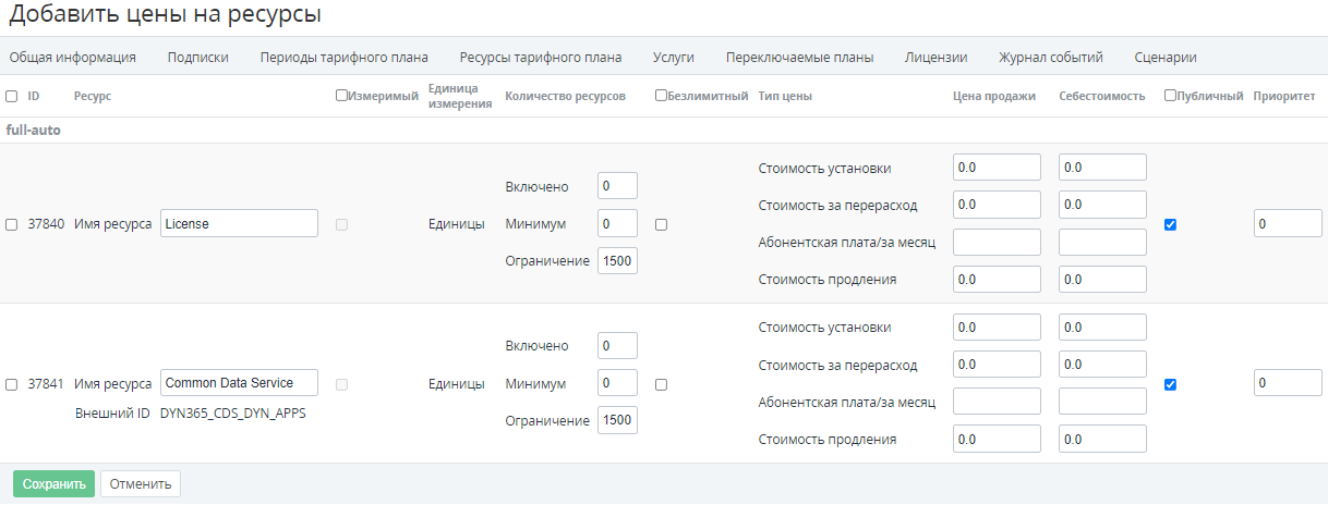 - Нажать кнопку Сохранить. Новый Ресурс будет добавлен и отобразится на вкладке Ресурсы тарифного плана. Автоматическая наценка Тарифного плана не изменяется.