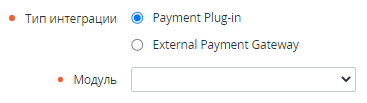 В группе настроек Тип интеграции, которые определяют, как будет осуществляться обработка платежей с использованием Способа оплаты, выбрать Payment Plug-in.