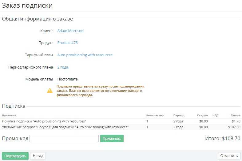 - На следующем шаге отобразится страница подтверждения Заказа. Страница содержит информацию о Клиенте, Продукте, Тарифном плане, периоде, модели оплаты, а также детали Заказа. Для модели оплаты Постоплата на странице дополнительно отображается пояснение порядка предоставления Подписки.