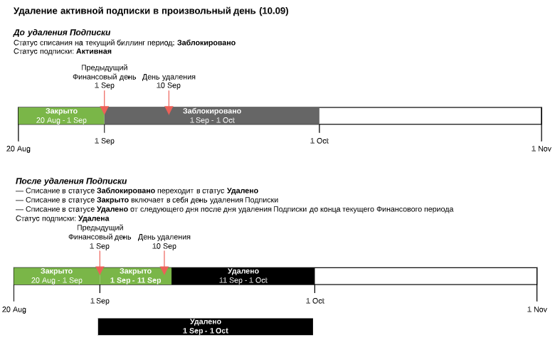 1. Списание в статусе Закрыто длительностью с начала текущего биллинг периода до дня удаления подписки (включительно)