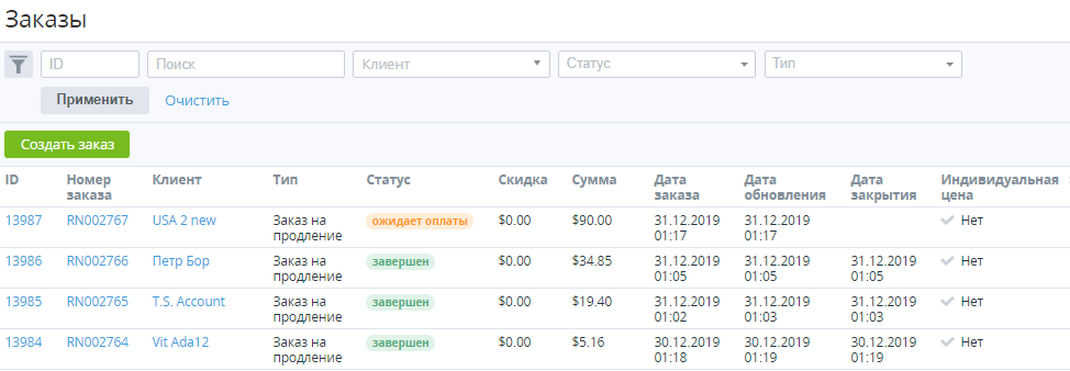 Чтобы просмотреть список заказов, перейдите в раздел Заказы (см. Навигация по Панели управления Оператора).