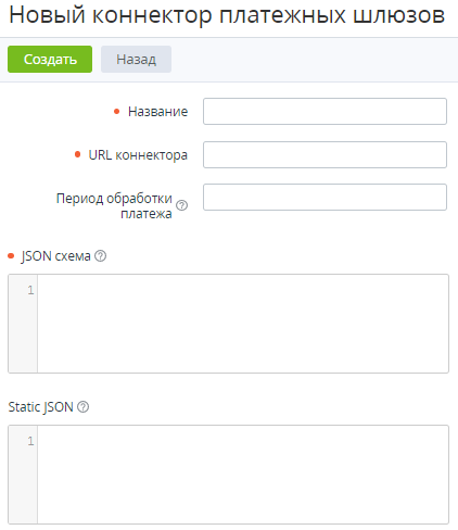 - Нажмите Создать. Отобразится страница Новый коннектор платежных шлюзов.