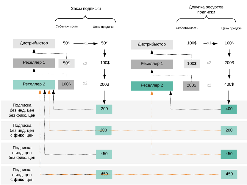 - Если подписка была заказана по индивидуальным ценам (см. Заказ подписки по индивидуальным ценам) или на тарифный план с фиксированной ценой, то при заказе дополнительных ресурсов, цены дозакупаемых ресурсов соответствуют ценам в заказе на покупку подписки (или ценам на момент добавления данного ресурса в подписку, если ресурс был добавлен позже).