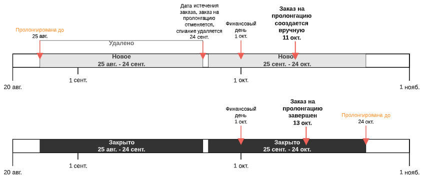 - Если заказ на пролонгацию не был завершен весь следующий месяц, то при наступлении даты окончания заказа на пролонгацию: