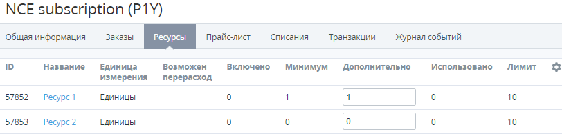 В строках изменяемых ресурсов в поле Дополнительно введите новые значения. Итоговое количество ресурса в подписке равно сумме значений в полях Дополнительно и Включено.
