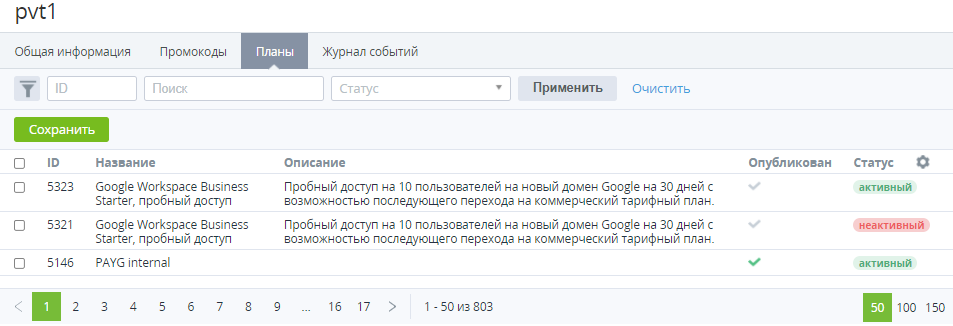 • Опубликован — признак доступности тарифного плана для заказа в Панели управления Клиента.