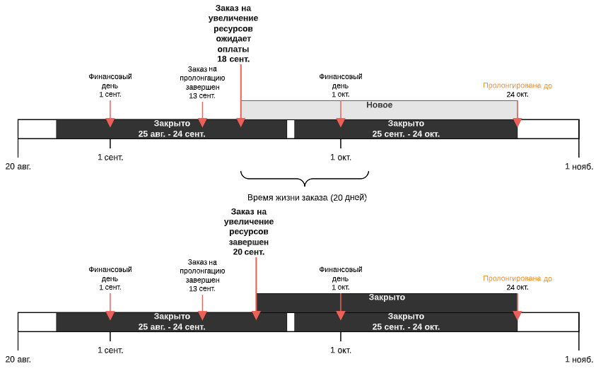 - Период: с даты создания заказа на изменение ресурсов до даты Оплачена до.
