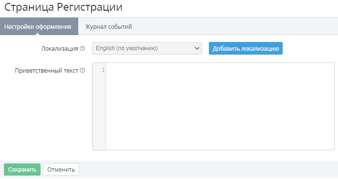 Страница Регистрации — раздел с настройками опционального текста приветствия, который может отображаться на странице регистрации Панели управления Клиента (см. Quick registration). Для каждого языка настройки собраны в группы: