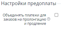 Объединять платежи для заказов на пролонгацию и продление — если флажок установлен, то все платежи для оплаты заказов на пролонгацию и заказов на продление, автоматически созданные для клиента биллинг-процессом в одну ночь, будут объединяться в один платеж (см. Объединение платежей по модели Предоплата). По умолчанию флажок не установлен и платежи автоматически не объединяются.