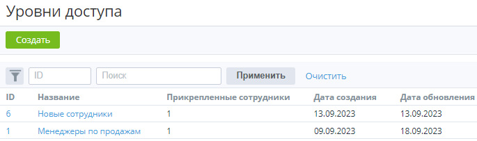 ID и название отображаются в виде ссылки на страницу с информацией об уровне доступа (см. Просмотр и обновление информации об уровне доступа).