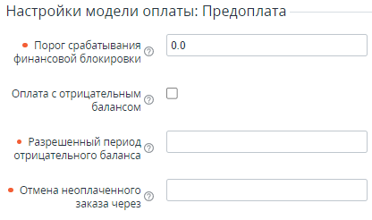 В группе Настройки модели оплаты: Предоплата — настройки для подписок по модели Предоплата: