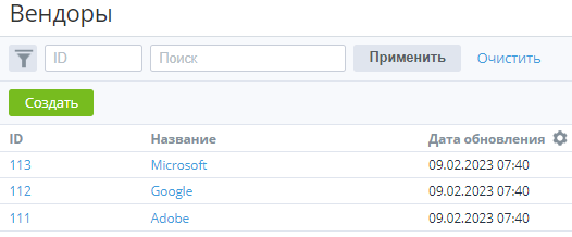 ID и название вендора отображаются в виде ссылки на страницу вендора (см. Управление созданным вендором).