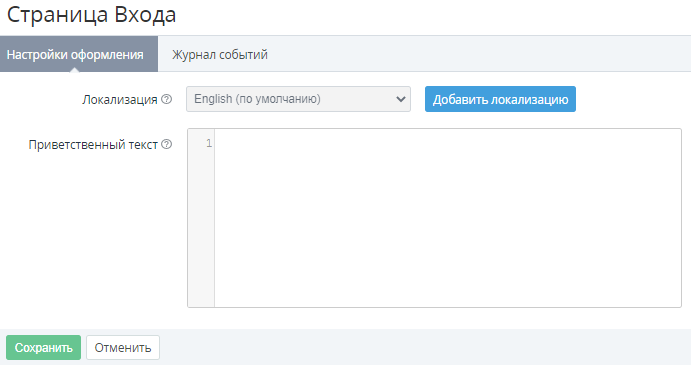 - Локализация — выбор языка, на котором должен отображаться текст приветствия. В первой группе по умолчанию и без возможности изменения выбран язык, который установлен по умолчанию для новых пользователей в Панели управления Клиента (см. Управление языковыми настройками).