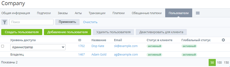 3. Перейдите на вкладку Пользователи. Отобразится список пользователей, связанных с выбранным клиентом (см. Управление пользователями клиента).