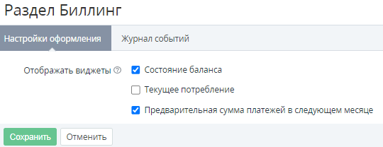 Раздел Биллинг — раздел с настройками Отображать виджеты для выбора виджетов, которые должны отображаться в разделе Биллинг Панели управления Клиента (см. Screen layout):