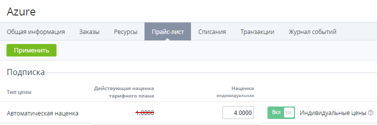 2. Нажмите Применить. Отобразится вкладка Прайс-лист с новым значением индивидуальной наценки для подписки, которое будет применяться при получении статистики использования услуги для формирования списания клиента.