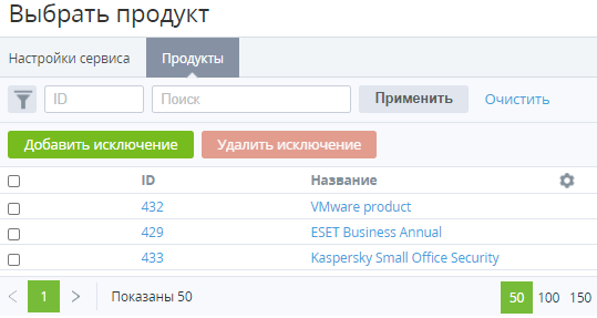 3. Перейдите на вкладку Продукты. Отобразится список продуктов, добавленных в исключения.