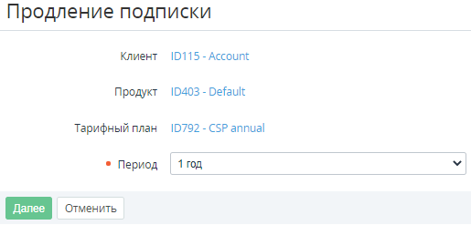 В списке Период выберите период, на который требуется продлить подписку, и нажмите Далее. Отобразится страница создания нового заказа на продление с информацией о тарифном плане, подписке и группой элементов для изменения количества ресурсов. Подробное описание групп элементов см. в Заказ подписки по ценам, указанным в тарифном плане.