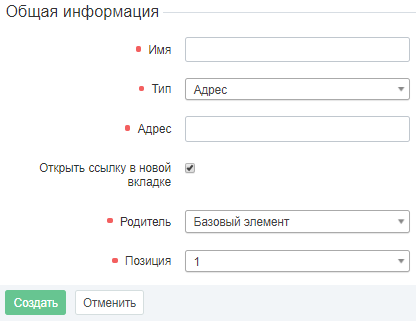 - Нажмите Создать. Отобразится страница создания пункта меню.