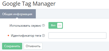 - Использовать сервис — если переключатель установлен в положение Вкл., сервис используется на всех страницах Панели управления Клиента. Для корректной работы необходимо получить идентификатор тега на стороне Google и указать его в поле ниже.