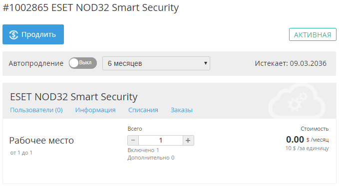 Раздел Биллинг предназначен для управления Подпиской на продукт "ESET NOD32".