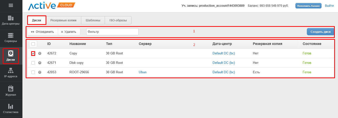 Вкладка Диски доступна по умолчанию и состоит из панели мульти-действий (1) и таблицы со списком всех дисков, имеющихся в Вашей инфраструктуре (2).