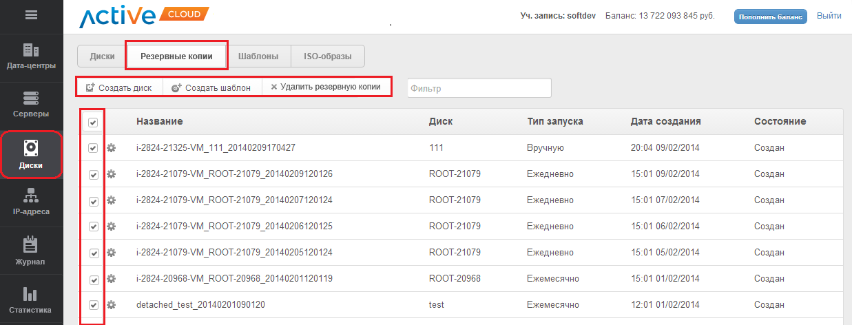Групповые действия над резервными копиями дисков проводятся при выборе ВСЕХ либо только интересующих элементов посредством кнопок выбора. С их помощью можно применить вышеперечисленные команды одновременно для всех или для нескольких выбранных копий дисков, не покидая текущей страницы, т.е. без переключения в режим администрирования каждого элемента.