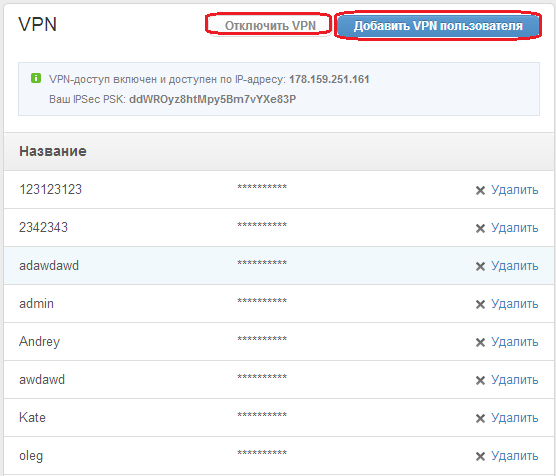 Новый пользователь будет добавлен в список VPN пользователей. Для того чтобы удалить пользователя из списка, нажмите на иконку с изображением значка крестика